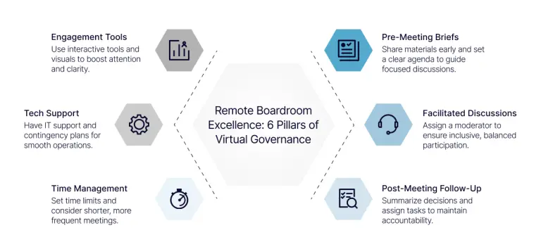 با تبدیل شدن حاکمیت از راه دور به استاندارد، هیات مدیرهها باید استراتژیهای سنجیدهای را اتخاذ کنند تا اطمینان حاصل کنند جلسات مجازی آنها هم کاربردی و هم تأثیرگذار است. فقدان حضور فیزیکی، چالشهایی را در ارتباطات، تعامل و پاسخگویی ایجاد میکند که میتوان با شیوههای صحیح بر آنها غلبه کرد و جلسات از راه دور را به اندازه همتایان حضوری مؤثر ساخت. این شیوهها به اعضای هیات مدیره کمک میکنند تا همسویی را حفظ کرده، گفتگوهای معنادار را پرورش دهند و استانداردهای بالای حاکمیت را رعایت کنند.